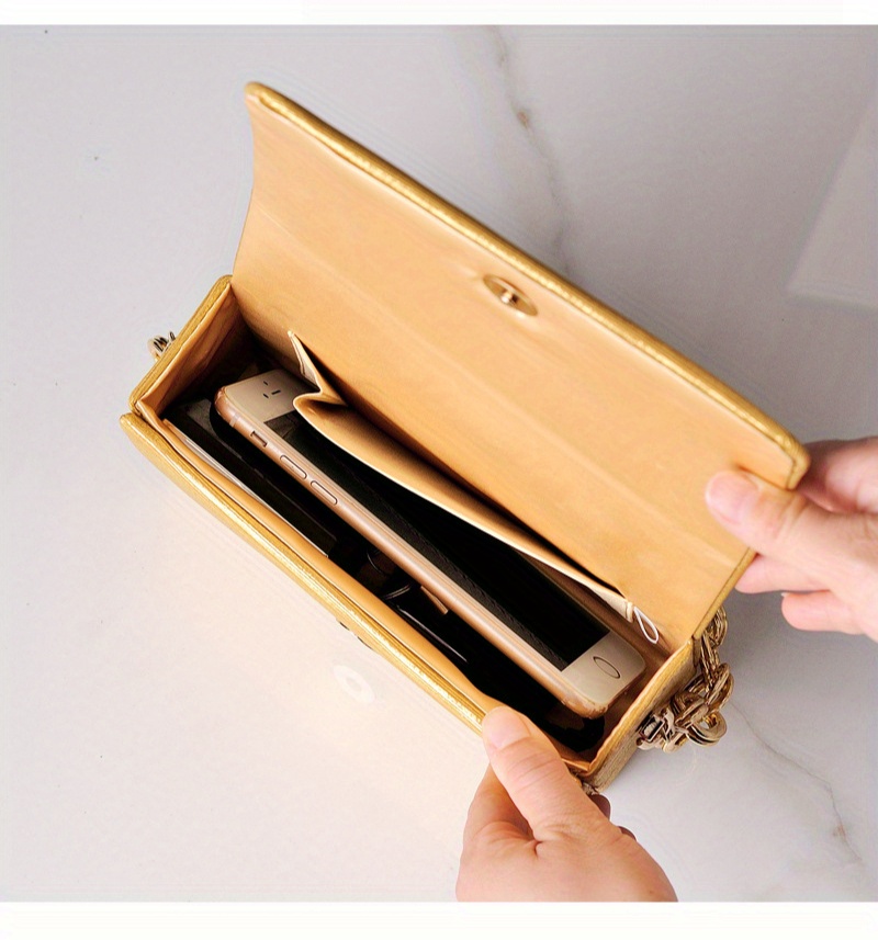 The chain strap allows for shoulder or crossbody wear, providing a chic look while keeping essentials like your phone, keys, and cards close at hand. Compact yet stylish, this bag combines fashion and practicality in a sleek, elegant package.