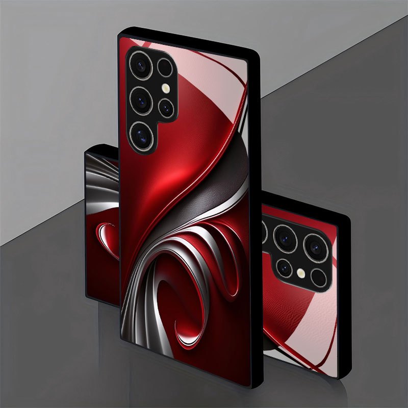 Red, black & golden abstract art Samsung phone case. Tempered glass back, slim, protective design. Compatible with S23-S25 series & stylishly trendy.